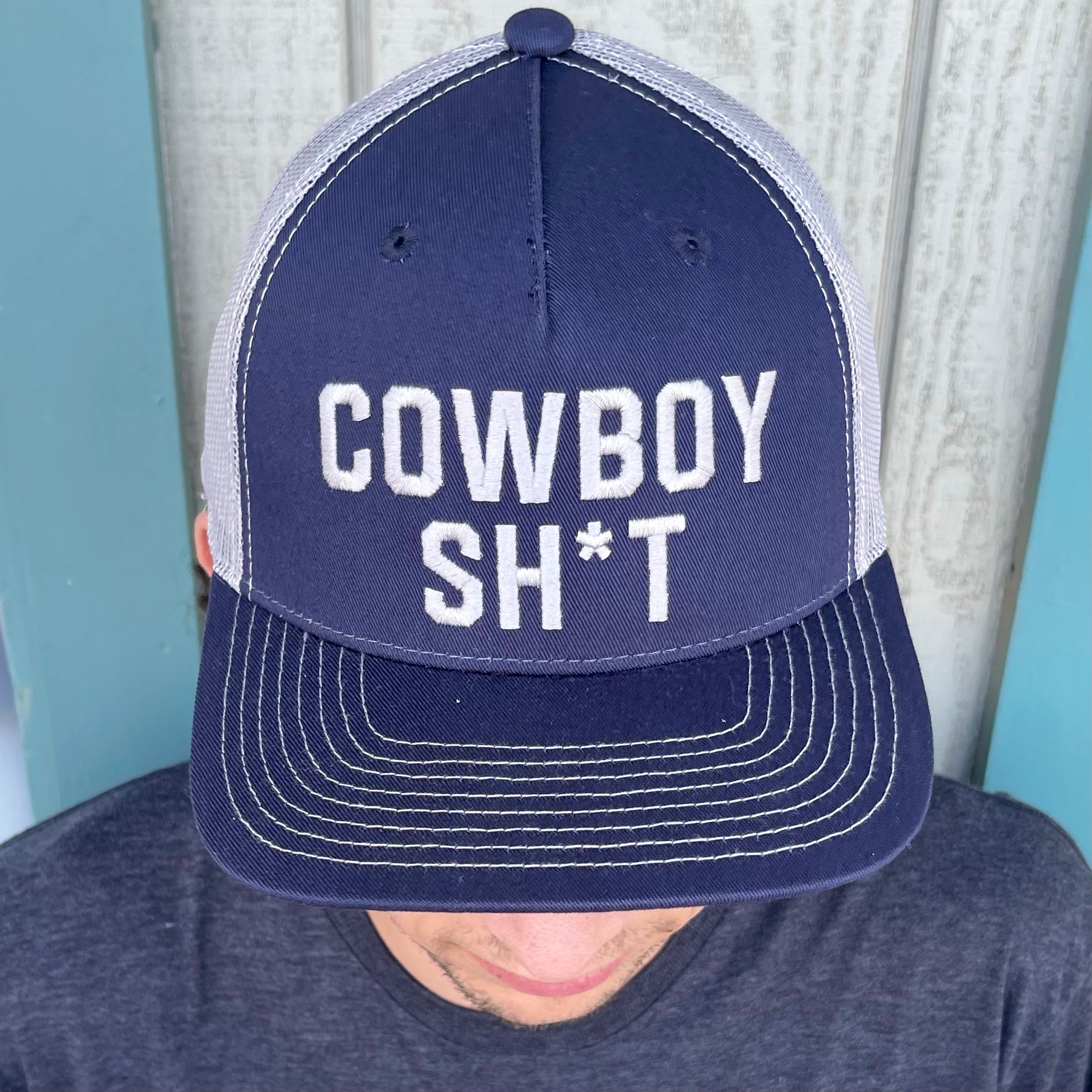 Leather, COWBOY SH*T embroidered on navy and white Yupoong snap back hat.